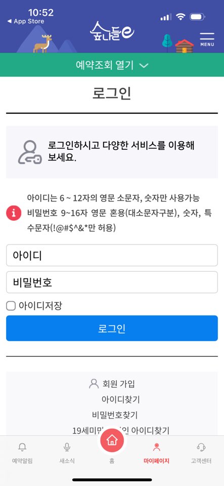 예약 숲나들e 사이트 홈페이지나, 숲나들e 앱에서만 가능합니다.