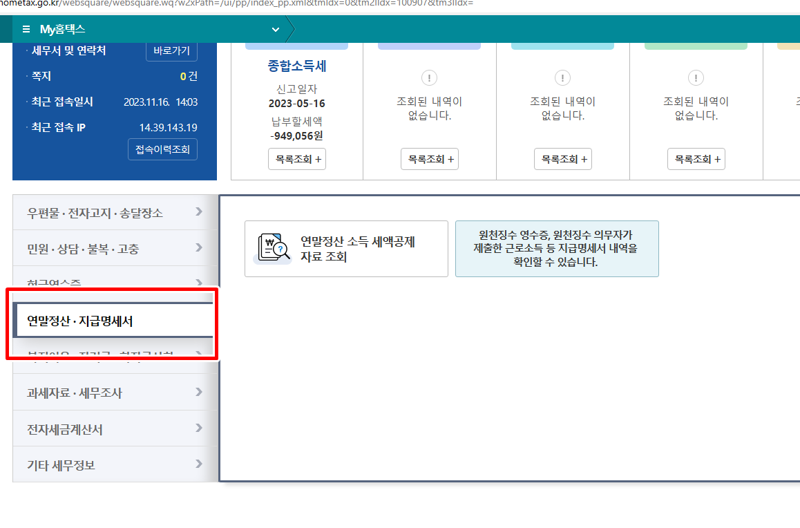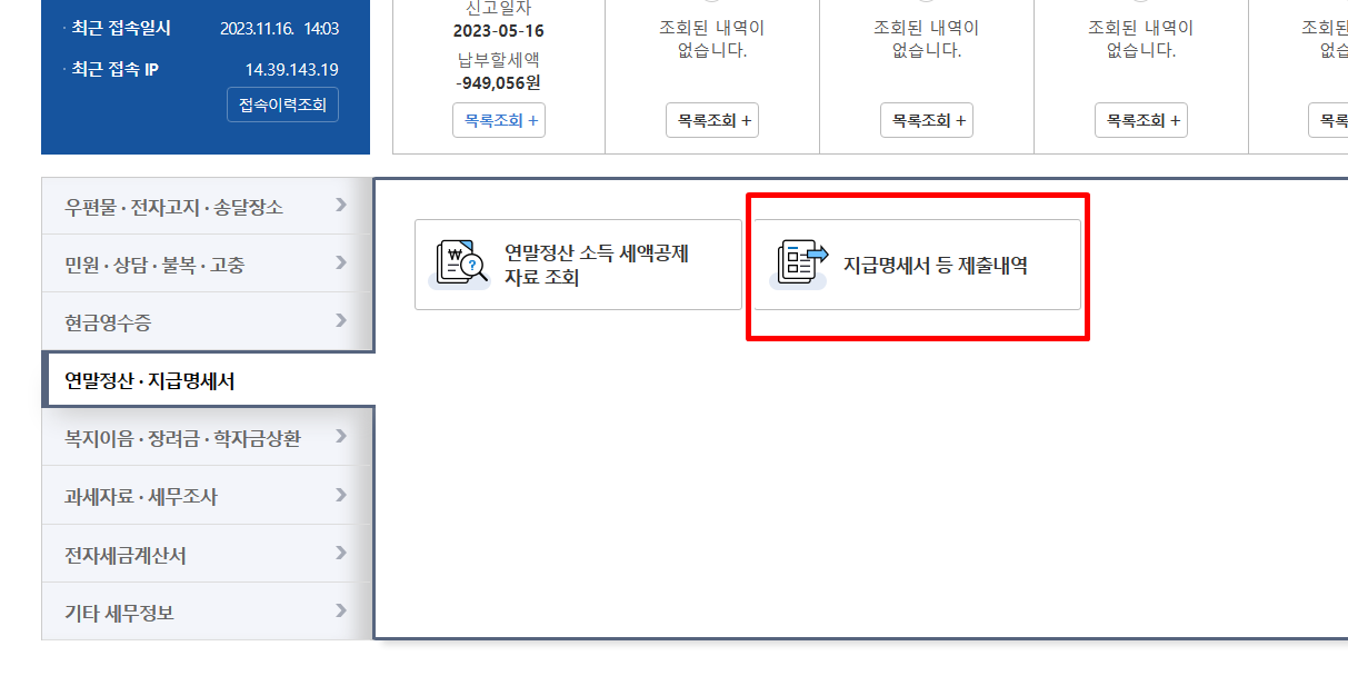 - 연말정산 지급명세서 란에서 지급명세서 등 제출내역을 확인한다.